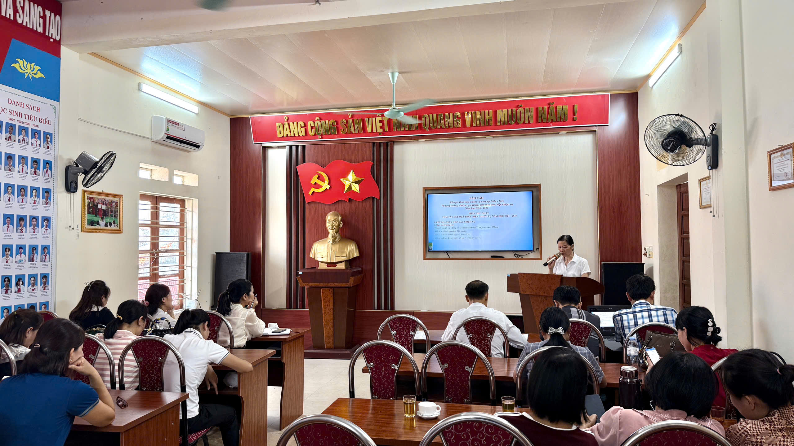 Tại hội nghị, đồng chí Phạm Thị Hợi – Bí thư Chi bộ, Hiệu trưởng nhà trường – đã trình bày báo cáo tổng kết năm học 2024 - 2025 và triển khai nhiệm vụ trọng tâm năm học 2025 - 2026. Đồng chí đã phân tích rõ 7 nhiệm vụ cơ bản và 10 giải pháp thực hiện nhiệm vụ năm học 2025 – 2026. Báo cáo đã nhận được sự thống nhất, đồng thuận cao từ tập thể hội nghị.